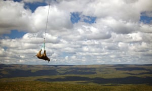 Off to the Med? … a rhino getting airlifted in South Africa. Photograph: Green Renaissance/Barcroft Media